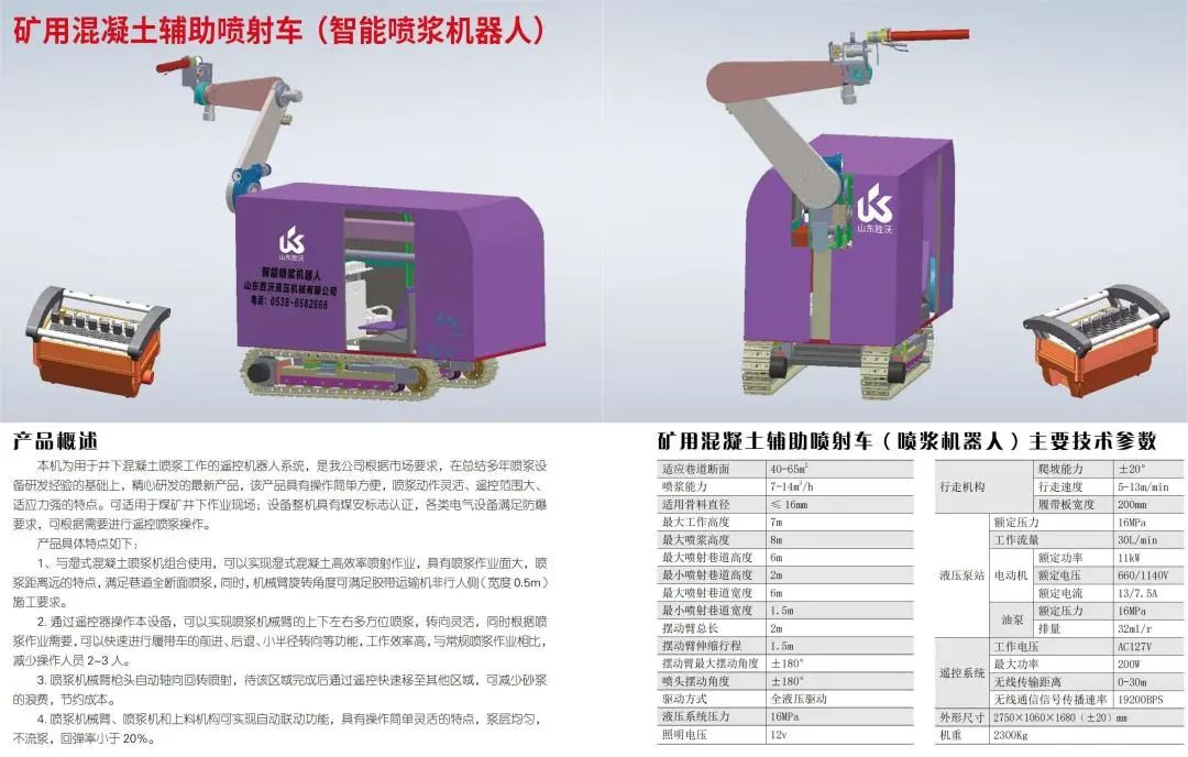 公司专注于生产矿用湿式推链式混凝土喷射机组、喷浆机器人、遥控履带湿式混凝土喷射机组、新型矿用混凝土输送泵(履带式)、新型混合成品料上料机,有每小时喷浆量7立方、10立方、14立方、16立方等多种产品。