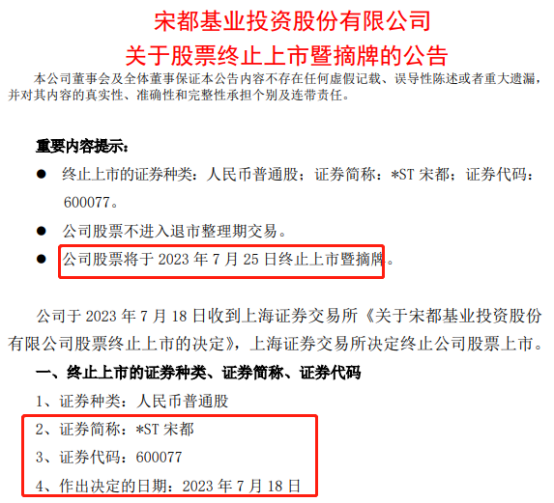 7月18日晚间,*ST宋都(600077)公告,公司当天收到上交所《关于宋都基业投资股份有限公司股票终止上市的决定》,公司股票将于2023年7月25日终止上市暨摘牌。