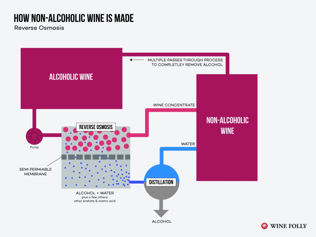 即通过特制的反渗透膜,对葡萄酒施加足够的压力,葡萄酒中的水和乙醇是较小的分子,所以它们最容易通过反渗透膜,以达到将其与酒精分离的目的。