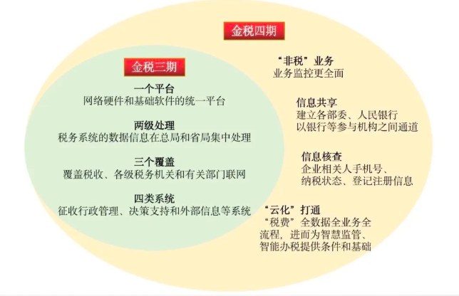 金税三期,实现了对国税、地税数据的合并及统一,其功能是对税务系统业务流程的全监控;而金税四期,不仅仅是税务方面,还会纳入“非税”业务,实现对业务更全面的监控。
