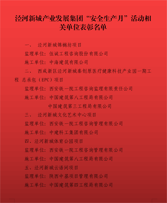 产业发展集团于6月举行“安全生产月”系列活动, 其中在泾河新城锦樾坊项目举办西咸新区暨泾河新城安全生产月启动仪式;西咸新区泾河新城秦创原医疗健康科技产业园一期工程总承包(EPC)项目举办安全、质量、文明施工、施工工艺观摩活动;泾河新城文化艺术中心项目举办个人技能比武活动;泾河新城体育公园项目举办绿化优秀项目观摩活动;泾河新城云语间项目举办“装配式建筑培训及项目现场观摩”活动。在活动期间,此五个项目积极配合,为产业发展集团系列活动的成功举办做了大量的工作。 为充分肯定“安全生产月”系列活动各协办单位的示范引领作用,产业发展集团决定对上述5个项目施工、监理单位给予通报表彰。 望受表彰的单位及项目珍惜荣誉、再接再厉,当好示范,做好表率,进一步强化项目标准化管理,为集团工程建设全面发展作出新的贡献。集团其他参建单位要以先进典型为榜样,学习经验、勤于探索、勇于创新,全面提高建筑工程生产管理水平,有力促进产业发展集团项目建设高质量发展。