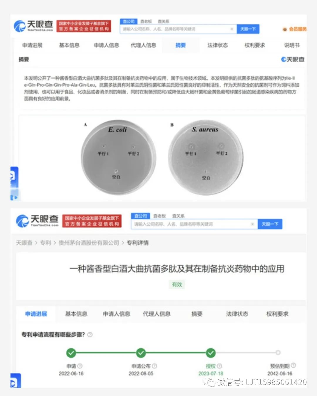 新京报讯 据企查查消息,贵州茅台酒股份有限公司申请的“一种酱香型白酒大曲抗菌多肽及其在制备抗炎药物中的应用”专利近日获授权。