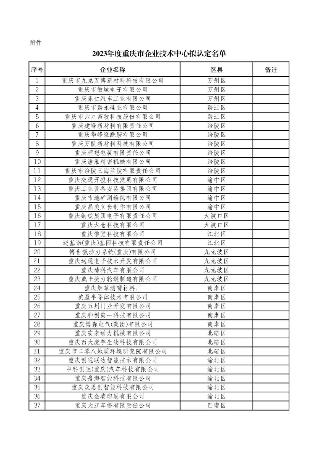根据《重庆市企业技术中心认定管理办法》(渝经信发〔2016〕86号)有关规定,市经济信息委印发了《关于开展2023年度重庆市企业技术中心认定工作的通知》(渝经信科技〔2023〕8号)。在企业自愿申报的基础上,经相关工作程序后,拟认定重庆市九龙万博新材料科技有限公司等100家企业技术中心为2023年度重庆市企业技术中心,现予以公示,请社会各界监督,公示期间如有异议,请实名来电或来访。