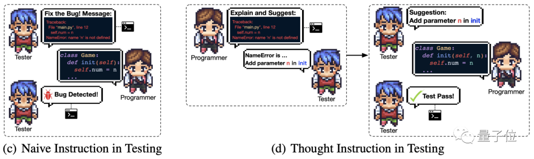 程序编好之后,就要进行测试了。测试环节分为对代码的审查和实际运行两步,涉及「代码审查员」和「测试工程师」两个角色。测试过程同样引入了「思维指导」机制,当测试反馈不明确时,程序员和测试工程师会进行角色互换。