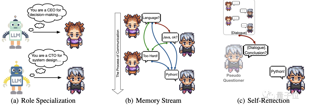 此外,设计环节中,每个bot具体扮演的角色,是由两个instructor(也是bot)分配的。为了提高设计工作的质量,团队还引入了「记忆流」和「自我反思」两种工作机制。