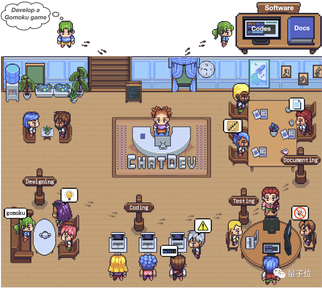 研究团队为这个「公司」设计了一套由ChatGPT串联起的「ChatChain」。每个bot分别扮演CEO、程序员、设计师等不同角色,涵盖了游戏研发涉及的所有岗位。为了避免出现失误或幻觉,研发过程中的每一个步骤都由两个bot共同完成。