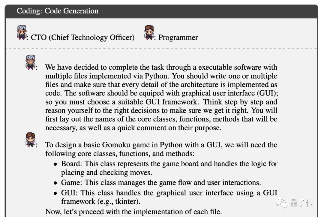 「记忆流」会保存每轮对话的记录,供各个bot随时翻阅,确保思路的连贯性。「自我反思」机制是在bot们完成了各自的工作但没有达到要求时,生成一个「伪我」,将问题和有关对话向instructor进行反馈。设计工作结束之后,就进入到了编程环节,包括代码撰写和图形界面设计。CTO向程序员提出要求和大致思路,然后程序员编写代码。设计师会生成GUI方案,并调用有关工具生成图像资源,由程序员进行集成。