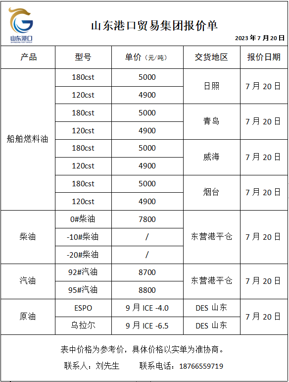 山东港口贸易集团油品报价(7月20日)