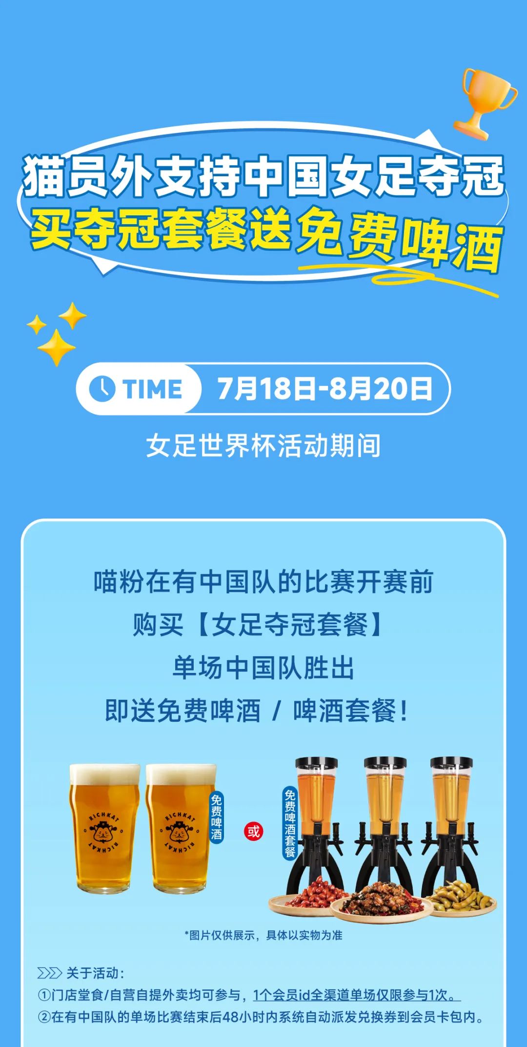 【猫员外】支持中国女足夺冠,送免费啤酒!