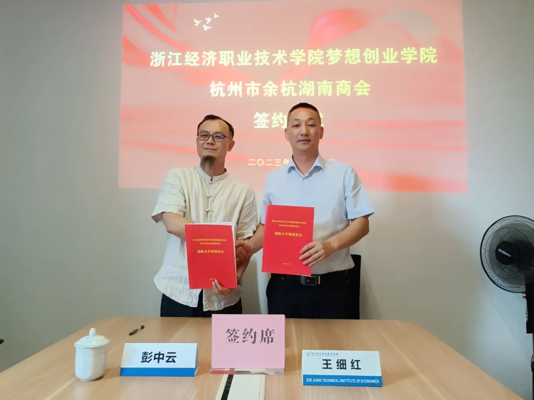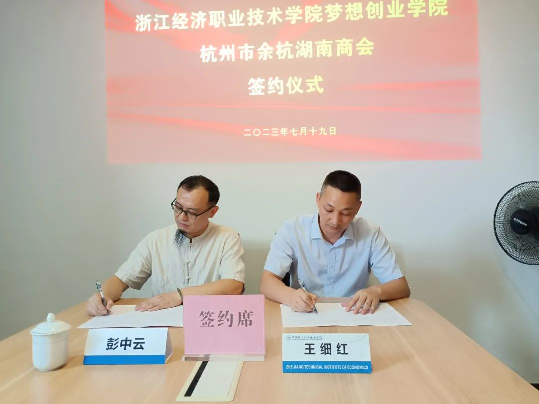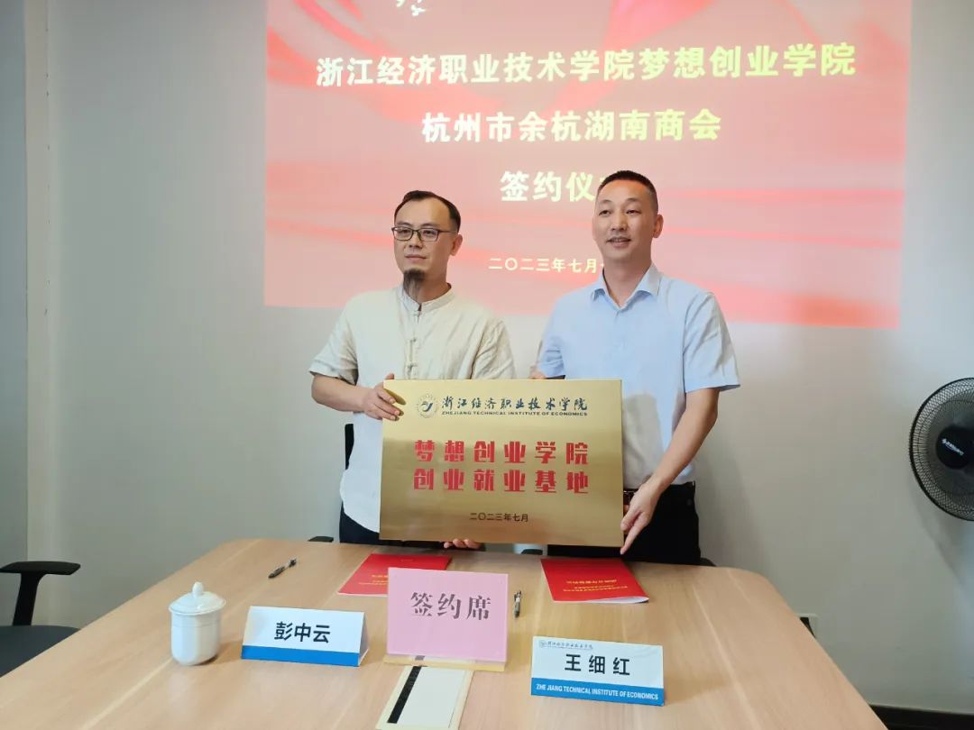 7月19日,余杭湖南商会与浙江经济职业技术学院梦想创业学院战略合作签约仪式在梦想创业学院成功举办。商会会长彭中云,常务副会长兼党支部书记段玉灵,常务副会长刘联军,理事陈林林,副秘书长朱钧参与走访和座谈会。浙江经济职业技术学院梦想创业学院王细红院长与彭中云会长现场签约并举行合作授牌“创业就业基地”仪式,梦想创业学院副院长张颖,教学秘书秋懿婷等全程陪同参观和座谈会交流。