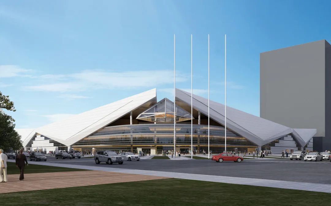 博兴县国际会展中心项目位于博兴县市民文化中心东侧,工程建筑面积23419平米,用钢量2500吨,其中跨度最大的钢桁架为76米,单榀钢桁架最重为63吨,球节点壁厚40mm,直径1100mm。