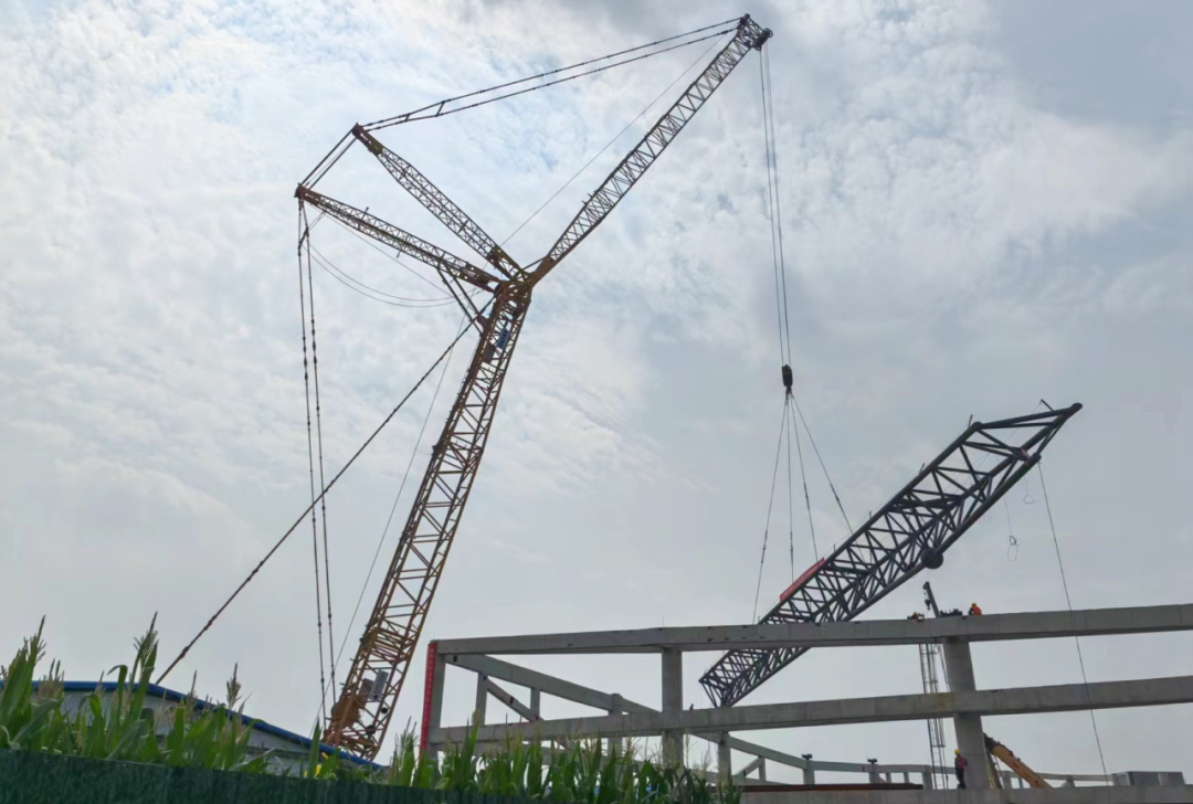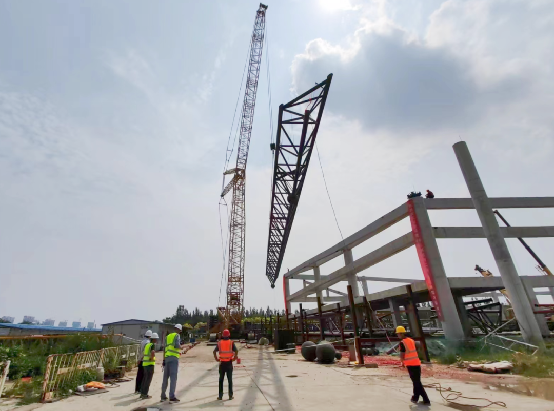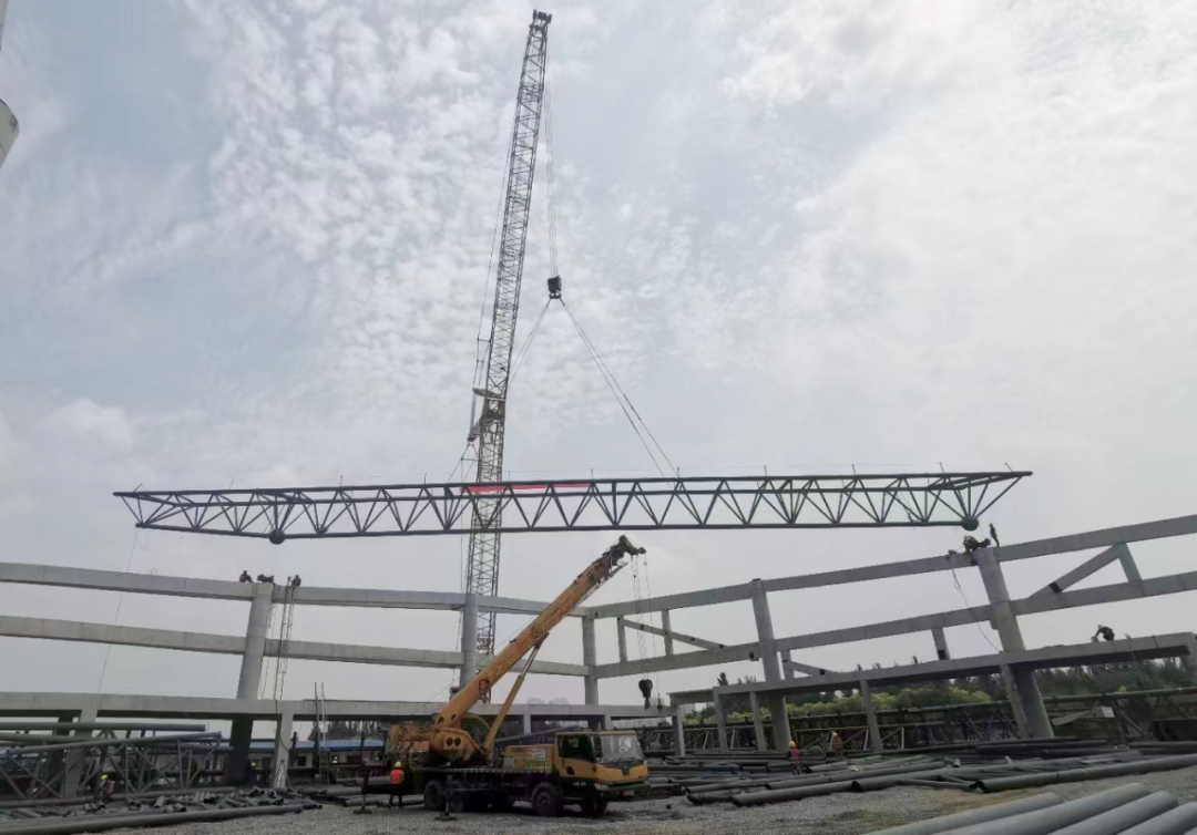 在吊装前,公司工程部人员与现场项目部人员、施工人员等进行了现场吊装方案的编制及安全技术交底工作,经过起钩、旋转、调整等一系列高精度动作,桁架安装成功,整个过程安全有序。