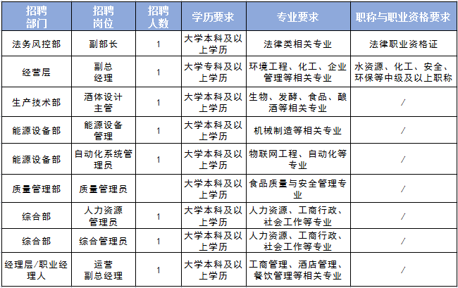 泸州白酒产业发展投资集团有限公司(以下简称:公司)于2020年12月31日在原“泸州白酒产业园区发展投资有限公司”(2015年7月成立,由酒业园区管委会管理)基础上,整合金三角酒业公司优化重组而成,注册资本金50.61亿元。公司立足全市白酒产业发展大局,以酒业园区基础设施建设、产城融合示范发展和清香型白酒的生产、销售为基础,将逐步打造为集园区基础设施建设与运营、产城融合、酒业协同发展为一体的白酒产业综合运营商和白酒小镇综合运营商,并在拓展白酒金融属性方面努力作为,为全市白酒产业发展延链强链补链,提供强有力的支撑和保障。2023年7月20日~2023年7月26日(每位应聘人员只能应聘1个岗位)。1.请应聘者如实认真填写《泸州白酒产业发展投资集团有限公司应聘表》(附件2)与《泸州白酒产业发展投资集团有限公司简历信息登记表》(附件3);2.请应聘者提供一份自荐材料。内容应包含但不仅限于个人简历及相关证明材料(个人简历包括个人基本情况、学习实践经历、个人成绩等信息,有工作经历的人员需提供相关任职证明材料);3.请应聘者需提供本人身份证、学信网学历学位证明、职(执)业资格证书、专业技术职务任职资格证书及工作业绩材料等相关资料的扫描件。4.请应聘者提供本人证件照(大小在30K以内)、生活照(大小在80K以内)各一张,限JPEG、PNG或JPG格式。以上报名材料将作为资格审查和综合评价的主要依据,须详细、认真、如实提供。若发现隐瞒有关情况或者提供虚假材料的,立即取消应聘资格。本次招聘采用网络报名、现场审核的方式进行。请将报名应提交资料以电子文档形式形成1个压缩文件夹发至:280467865@qq.com(电子邮件标题统一按照“姓名-应聘岗位”格式编写)。固定布局