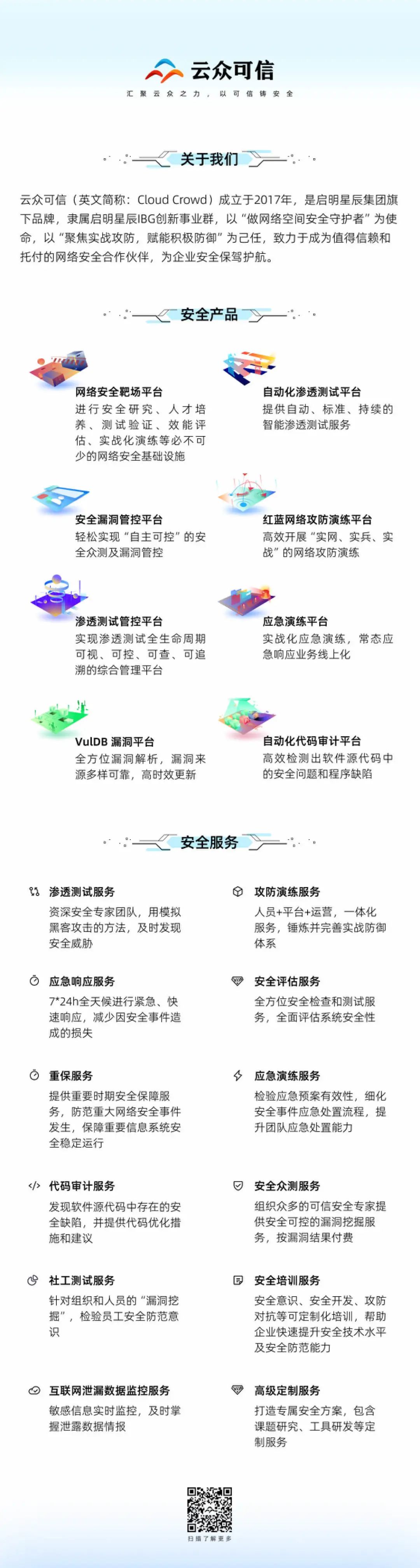 7月5日-7日,新耀东方-2023第二届上海网络安全博览会暨高峰论坛在上海顺利召开。本次大会通过“展览+论坛”的创新融合方式,为与会嘉宾带来了一场网络安全年度盛宴。启明星辰集团受邀参展,精彩亮相,向与会观众全方位展示其卓越的技术实力与创新成果。启明星辰“云众可信网络安全靶场”、“云众可信红蓝网络攻防演习平台”、“云众可信安全漏洞运营解决方案”、“云众可信网络安全应急指挥平台”齐聚展台,合体亮相。平台适用全行业安全建设需求,并成功实现了国产化适配,帮助用户夯实安全基础,筑牢安全防线。目前,平台已广泛应用于特种单位、大型央企、科研院所等,并在政府、能源、工控、金融、电力等行业表现出众,获得用户的一致青睐及好评认可。平台基于真实环境,为用户提供覆盖攻防演练全生命周期管理。平台着力解决演练组织、演练过程等阶段中存在的信息分散、不规范、效率低、态势维度单一、风险管控与综合评估手段弱等问题,帮助用户实施高质量攻防演练并提供多维大屏展示及双向复盘支撑。围绕企业众测体系建设打造的集安全众测、漏洞管理、安全审计于一体的综合解决方案。紧贴真实业务场景及用户需求,帮助企业快速构建专属应急响应中心(SRC),实现自主可控的众测管理,高效协作的漏洞管理及精确追踪的审计管理。平台高度还原网络安全事件真实场景,助您快速建设常态化应急响应协同体系,高效开展网络安全应急联动协同处置,实现线上化的网络安全应急指挥和一站式管理。面对日益激烈的网络空间对抗,网络信息安全理念已经从被动安全转向主动安全。作为启明星辰集团旗下品牌,云众可信坚持实战攻防领域的研究与探索,凭借出众的实力和技术,提供紧跟前沿技术,紧贴客户需求的网络安全产品、解决方案,助力用户不断提高网络安全防护能力,为构建网络强国、保障国家信息安全贡献自己的力量。奖项 | 实力如选《嘶吼2023网络安全产业图谱》