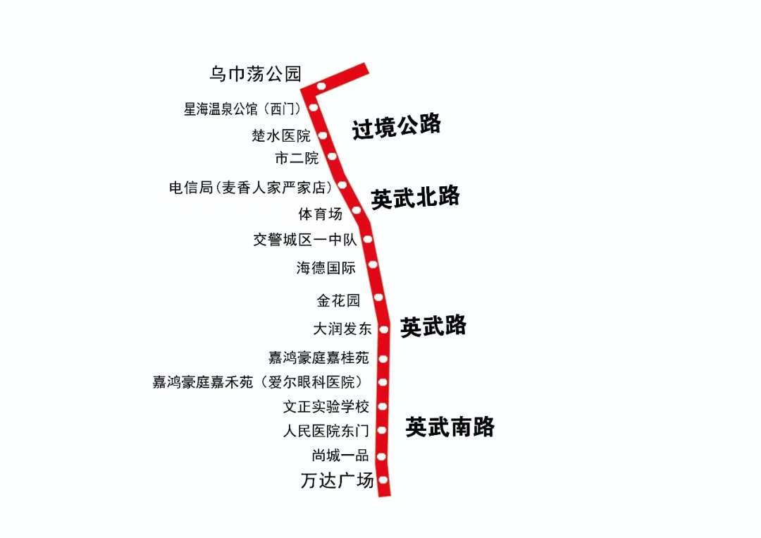 万达广场—尚城一品—人民医院东门—文正实验学校—嘉鸿豪庭嘉禾苑(爱尔眼科医院)—嘉鸿豪庭嘉桂苑—大润发东—金花园—海德国际—交警城区一中队—体育场—电信局(麦香人家严家店)一市二院一楚水医院一星海温泉公馆(西门)—乌巾荡公园