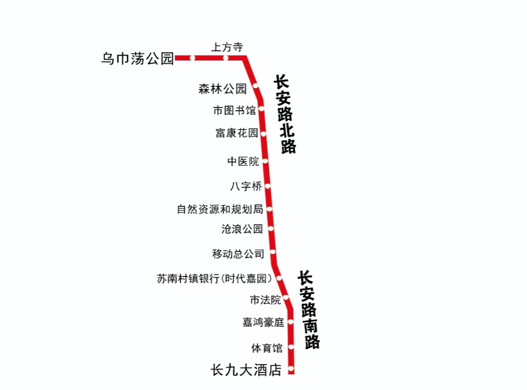 长九大酒店—体育馆—嘉鸿豪庭—市法院—苏南村镇银行(时代嘉园)—移动总公司—沧浪公园—自然资源和规划局(林业局)—八字桥—中医院—富康花园—市图书馆—森林公园—上方寺—乌巾荡公园