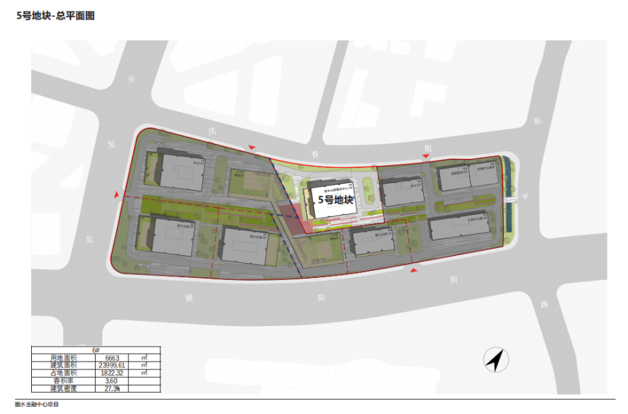 丽水创新金融中心一期项目坐落于丽阳街与开发北路交叉口东北侧,其中5#地块出让面积为6663平方米,主用途为商务金融用地,3.6≤容积率≤3.61,23.1%≤绿化率,建筑密度≤29.0%。