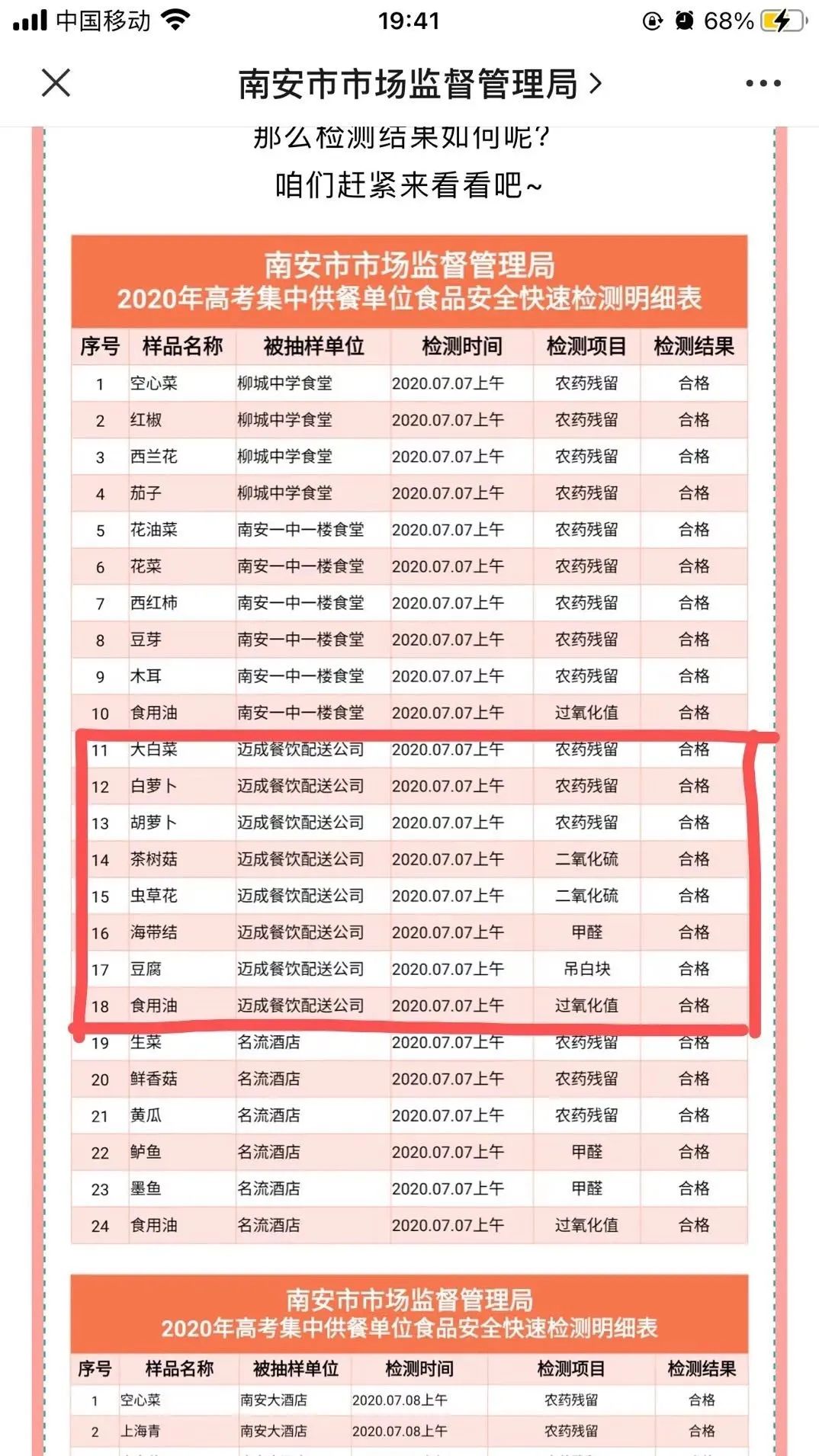 2020年高考,南安市市场监督管理局到我司进行随机蔬菜抽选检测,结果均合格!