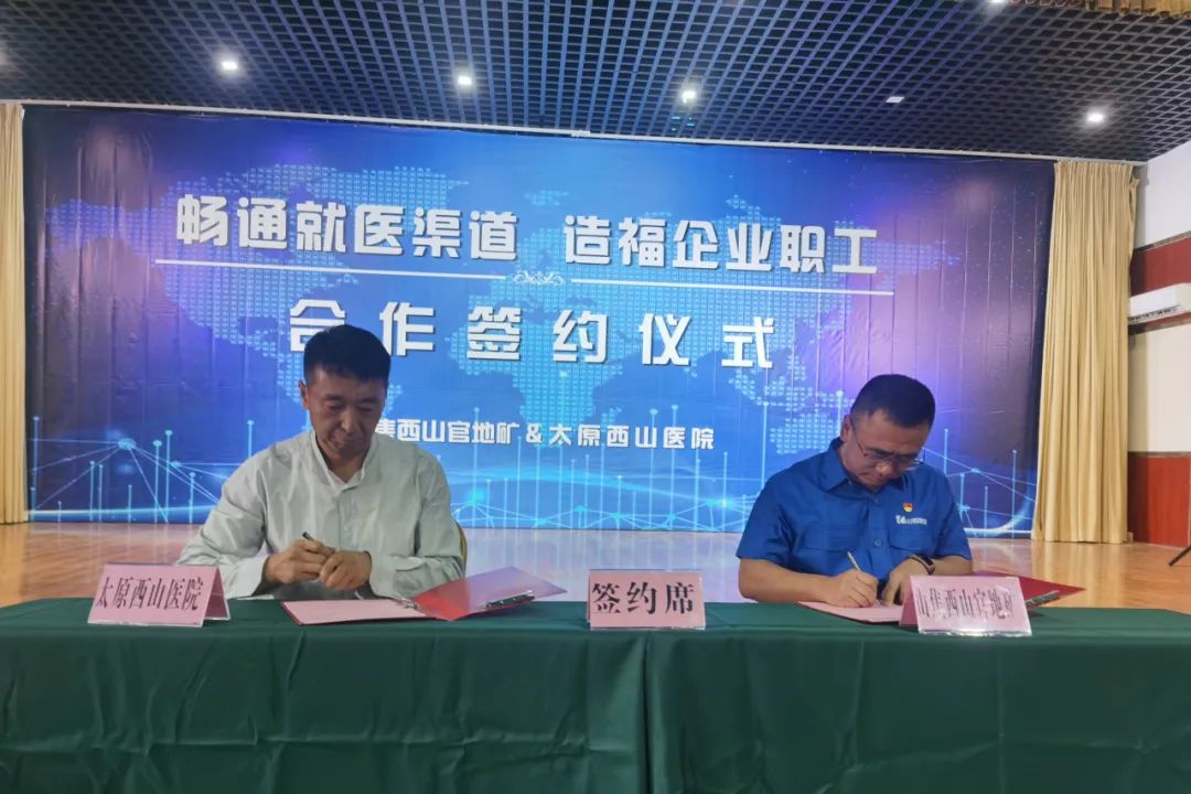 7月20日,太原西山医院副院长赵美平与山西焦煤西山煤电官地矿工会主席王志嵘在“畅通就医渠道 造福企业职工”合作意向书上签名,标志着太原西山医院与官地矿合作签约。