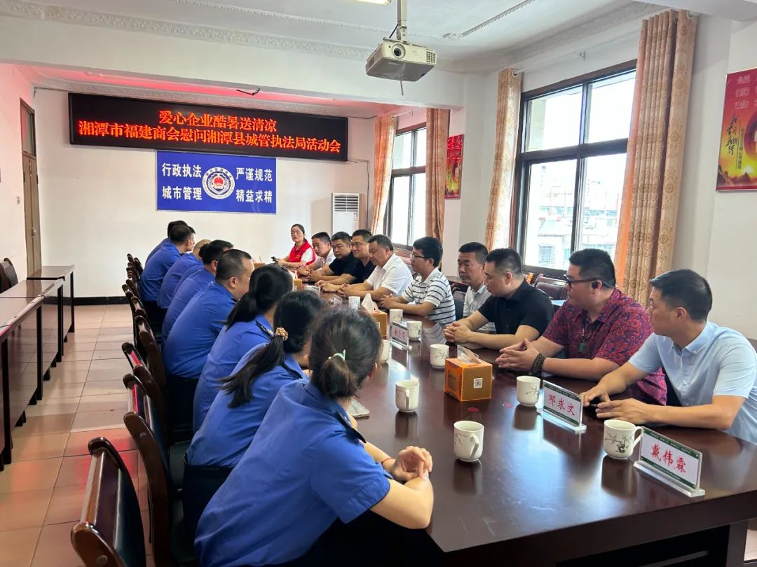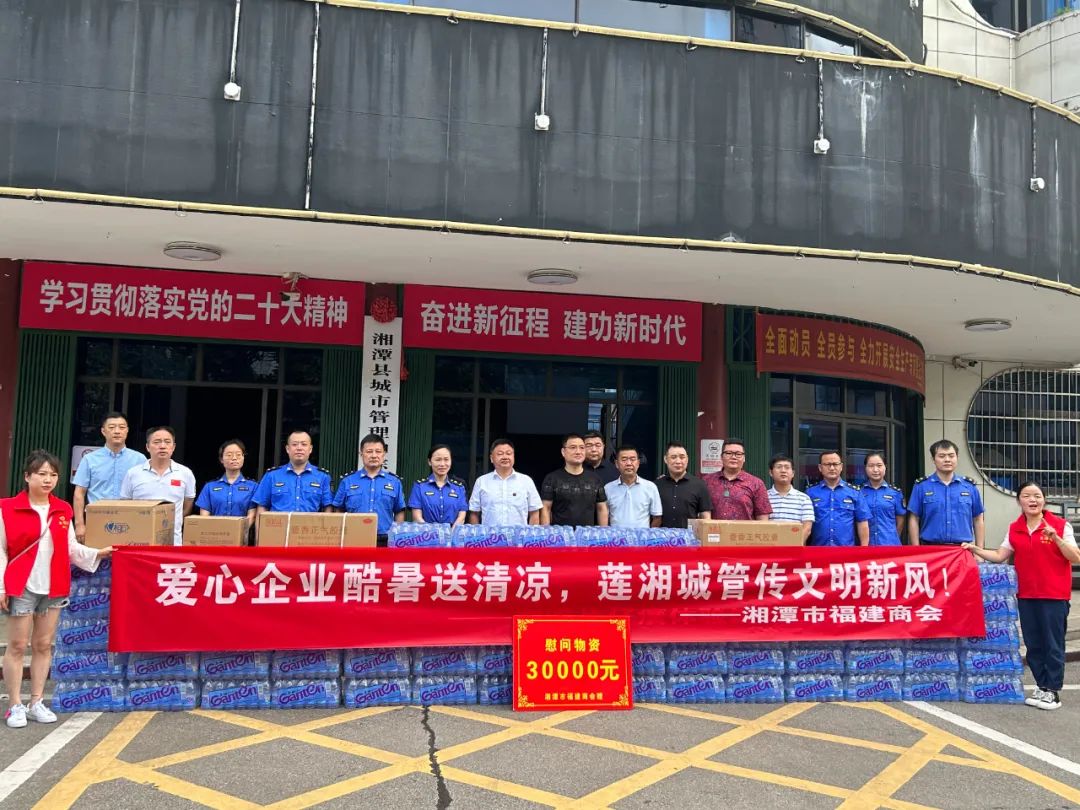炎炎夏日,满满真情。7月18日,湘潭市福建商会携会员企业湘潭片仔癀体验店前往湘潭县城管执法局开展“爱心企业酷暑送清凉”活动。市工商联党组成员、副主席、商协会党委书记章顺新,市福建商会执行会长林国发、名誉会长陈辉等参加活动。