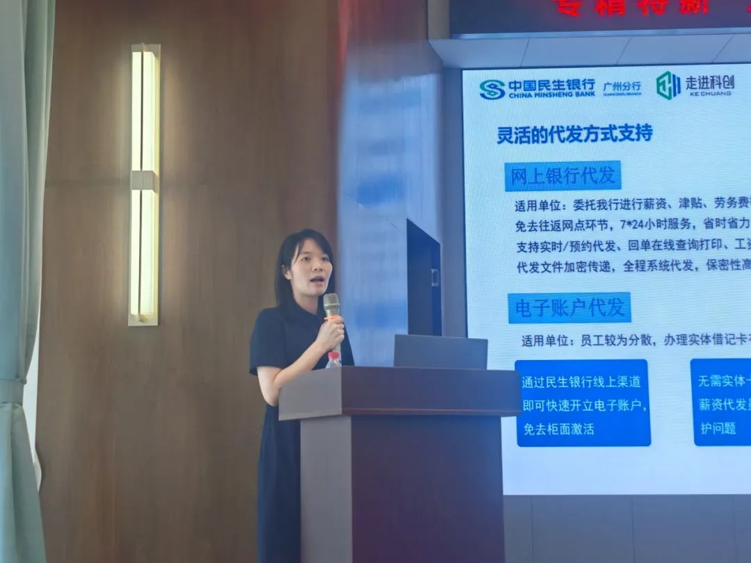 广州市知识产权局评审专家库专家王波峰老师、民生银行广州分行科创金融特派员潘美婷及广州金控数字科技有限公司推广部相关负责人张茜分别为参会企业做专利预审服务解答、民生科创企业综合金融服务方案及广州“信易贷”平台的介绍,帮助企业更好的理解高专利信息对企业战略布局的重要性,同时也帮助更多企业匹配合适的金融产品,为企业的高质量发展赋能。