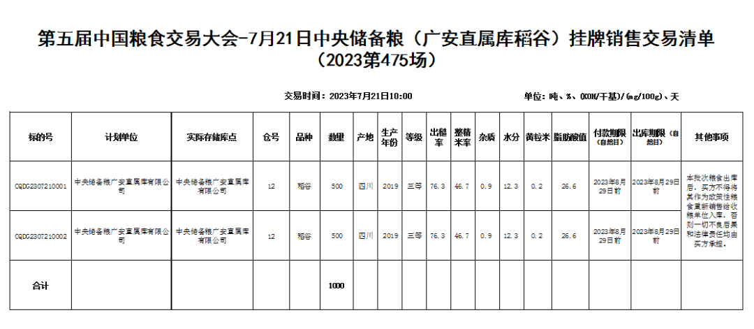 第五届中国粮食交易大会-7月21日中央储备粮(广安直属库稻谷)挂牌销售交易会公告(2023第475场)