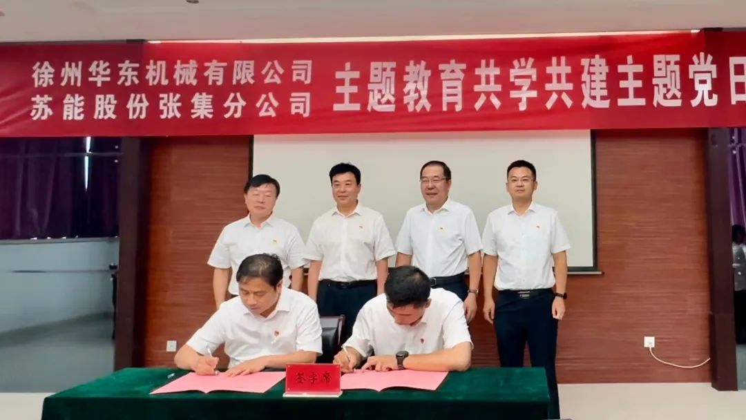 接着,全体人员来到华东机械公司,在工作人员的引导下,大家依次参观了华东机械公司的党建工作室、文化广场、综采液压支架智能化生产车间等地,聆听讲解,感受蝶变,学习党建工作及主题教育先进经验。参观结束后,全体人员到华东机械公司二楼会议室开展主题教育“共学共建”主题党日活动。张集分公司党委书记周正跃代表公司党委及参加活动的全体人员对华东机械公司的热情接待和经验分享表示感谢,并交流了张集分公司主题教育开展情况及异地项目部党建工作。周书记表示,来到华东机械公司参观研学是张集分公司主题教育(第三阶段)专题读书班的重要内容。华东机械公司是一家“百年老店”,在经历发展阵痛后,成功闯出了一条高质量发展的新路子,形成了别具一格、特点鲜明的“华东经验”。周书记说,今天的“魅力华东”令人向往,通过参观党群活动中心、主题教育文化广场、综采液压支架智能化生产车间,我们感到耳目一新、大受震撼,深刻感受到“百年华东”奋斗不息、积极进取的精神。张集分公司党委、华东机械公司党委以及下属党支部之间建立了友好关系,希望双方充分发挥自身优势,深入交流党建工作经验,加强基层组织建设,相互学习借鉴、取长补短,共同提升党建工作水平。同时,也恳请华东机械公司的技术专家能够在煤矿液压支架、大型运输机和煤机电器使用维护方面给予大力指导和帮助。华东机械公司党委书记、董事长庄静对张集分公司党员干部的到来表示热烈欢迎。庄书记简要介绍了华东机械公司的历史沿革以及2018年以来蝶变发展的不凡历程,着重介绍了华东机械公司主题教育工作开展情况。庄书记说,华东机械公司与张集分公司同属于徐矿集团,是一脉相承、血脉相连的兄弟单位,张集分公司作为集团公司服务外包产业的标杆企业,有许多经验做法值得我们思考和借鉴,华东机械公司热切希望双方能够借此机会共学共建、共促共进,携手奋进探索高质量发展新思路和新举措,不断为集团公司“一核两极”新发展格局贡献力量。华东机械公司机电中心党支部书记王栋、张集分公司玉华项目部党总支书记于广超分别作了基层党建工作交流。交流结束后,张集分公司玉华项目部党总支部与华东机械公司机电中心党支部签订了党建共建协议书。