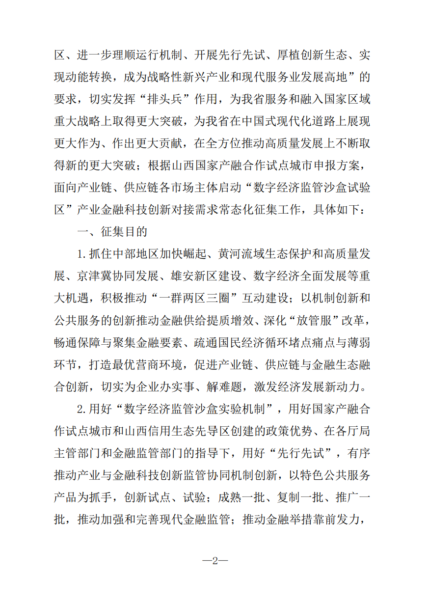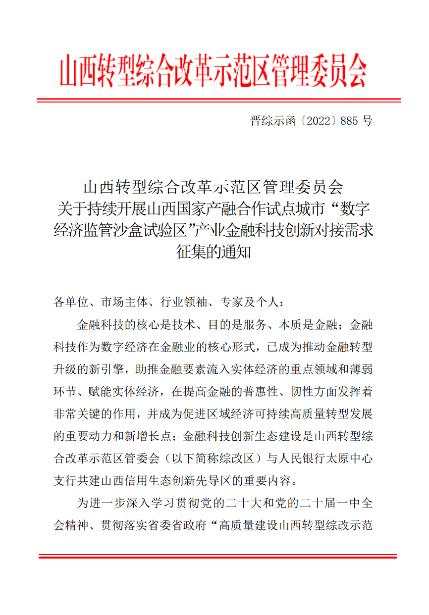 链接:关于持续开展山西国家产融合作试点城市“数字 经济监管沙盒试验区”产业金融科技创新对接需求征集的通知-山西转型综合改革示范区管理委员会 (shanxi.gov.cn)