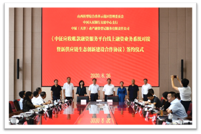 山西综改示范区管委会、中国人民银行太原中心支行、中征(天津)动产融资登记服务有限责任公司举行签约仪式,三方签订《中征应收账款融资服务平台线上融资业务系统对接暨新供应链生态创新建设合作协议》,进行系统对接并开启供应链“双平台”创新共建模式。各方将发挥各自优势,共同推动围绕贸易行为数字化、应收账款凭证化标准化、产业金融监管的协同化、融资便捷化,定标准、建生态。