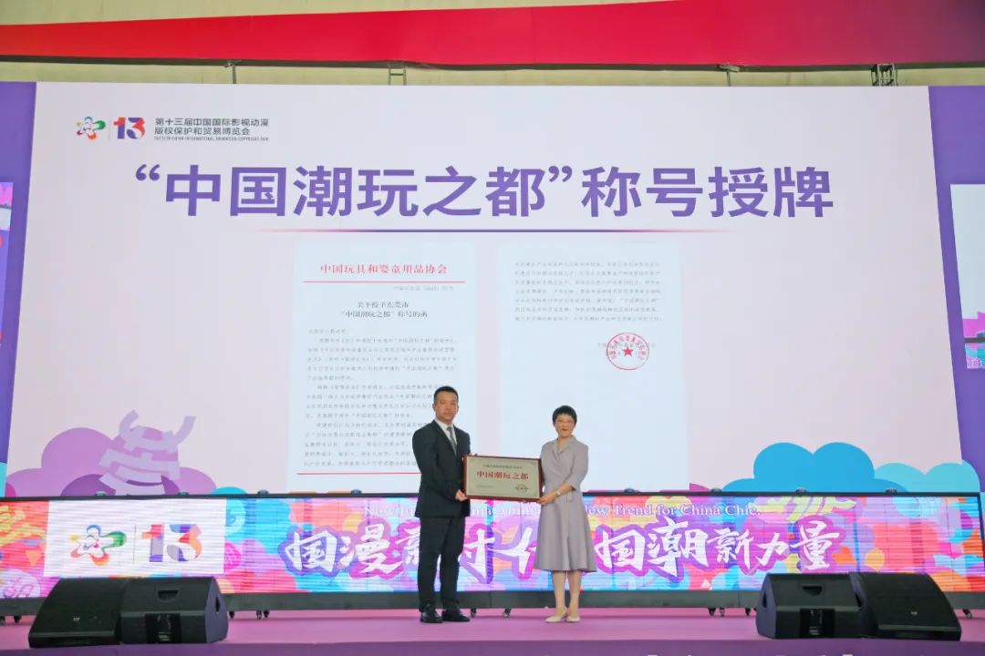 7月20日上午,第十三届中国国际影视动漫版权保护和贸易博览会正式在东莞开幕。启动仪式上,中国玩具和婴童用品协会授予东莞全国唯一的“中国潮玩之都”称号。