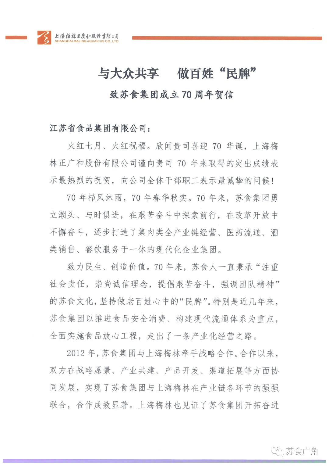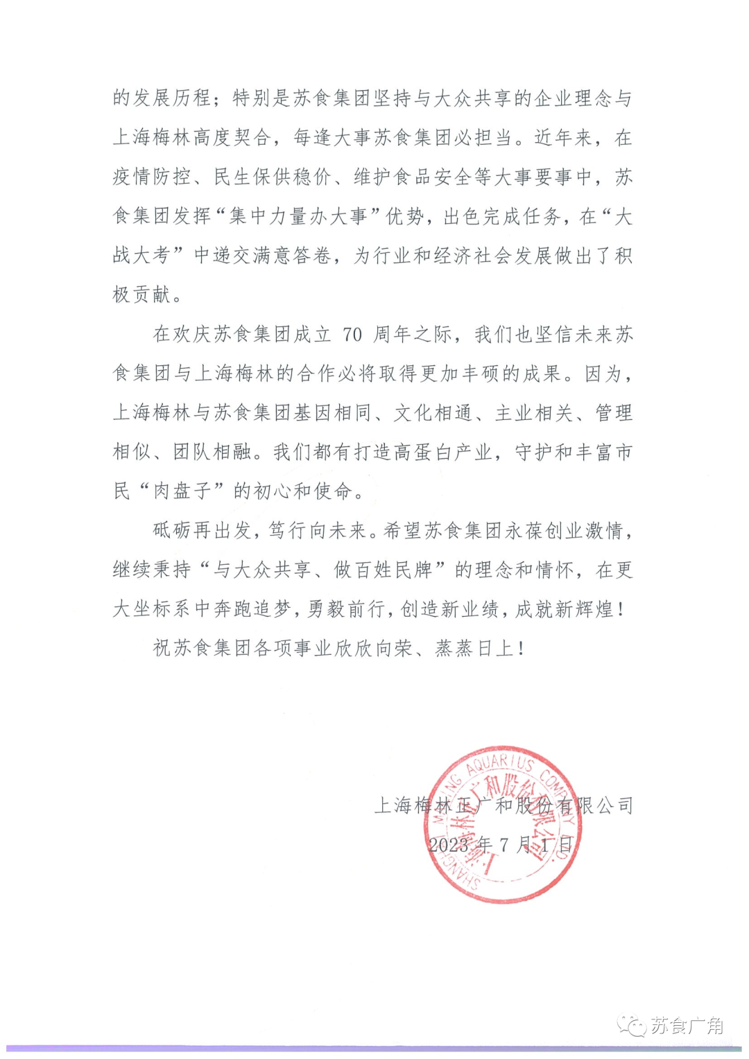上海梅林正广和股份有限公司致苏食集团成立70周年贺信