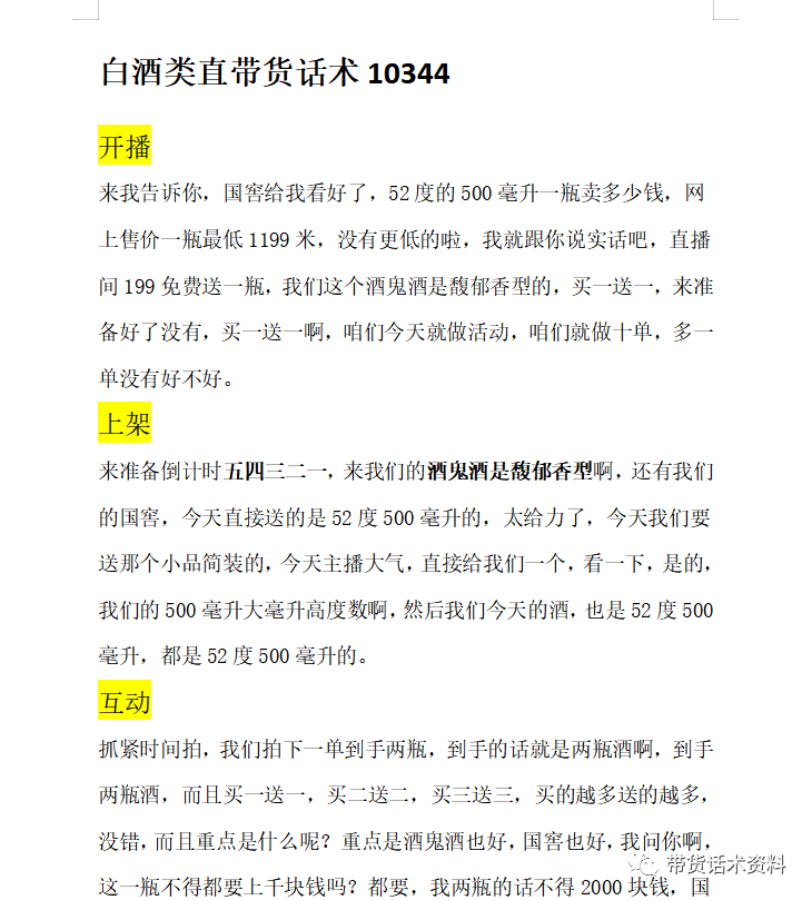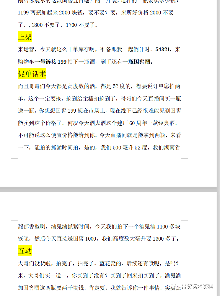 话术简介:产品:酒鬼酒,国窖,红酒,泸州老窖头曲,五粮液金密鉴,郎酒,普郎 介绍:介绍了酒的产品特色价格,口感质地和香型度数,主推和粉丝互动促进卖点成交。