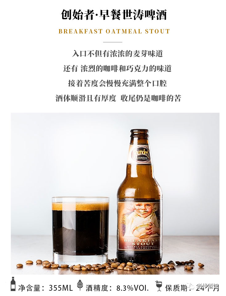 美国市场上最经典的一款早餐世涛来自创始者,这款酒标上印着吃早餐的孩童的啤酒,多年来深受消费者欢迎,它使用了用去壳燕麦、黑巧克力和苏门答腊咖啡、科纳咖啡,将其倒入品脱杯,黑色的酒液与褐色的酒头预示了其酒体之厚重,闻着是浓郁的咖啡香味,入口则能明显分辨出咖啡、巧克力与酒花的苦味,层次分明。