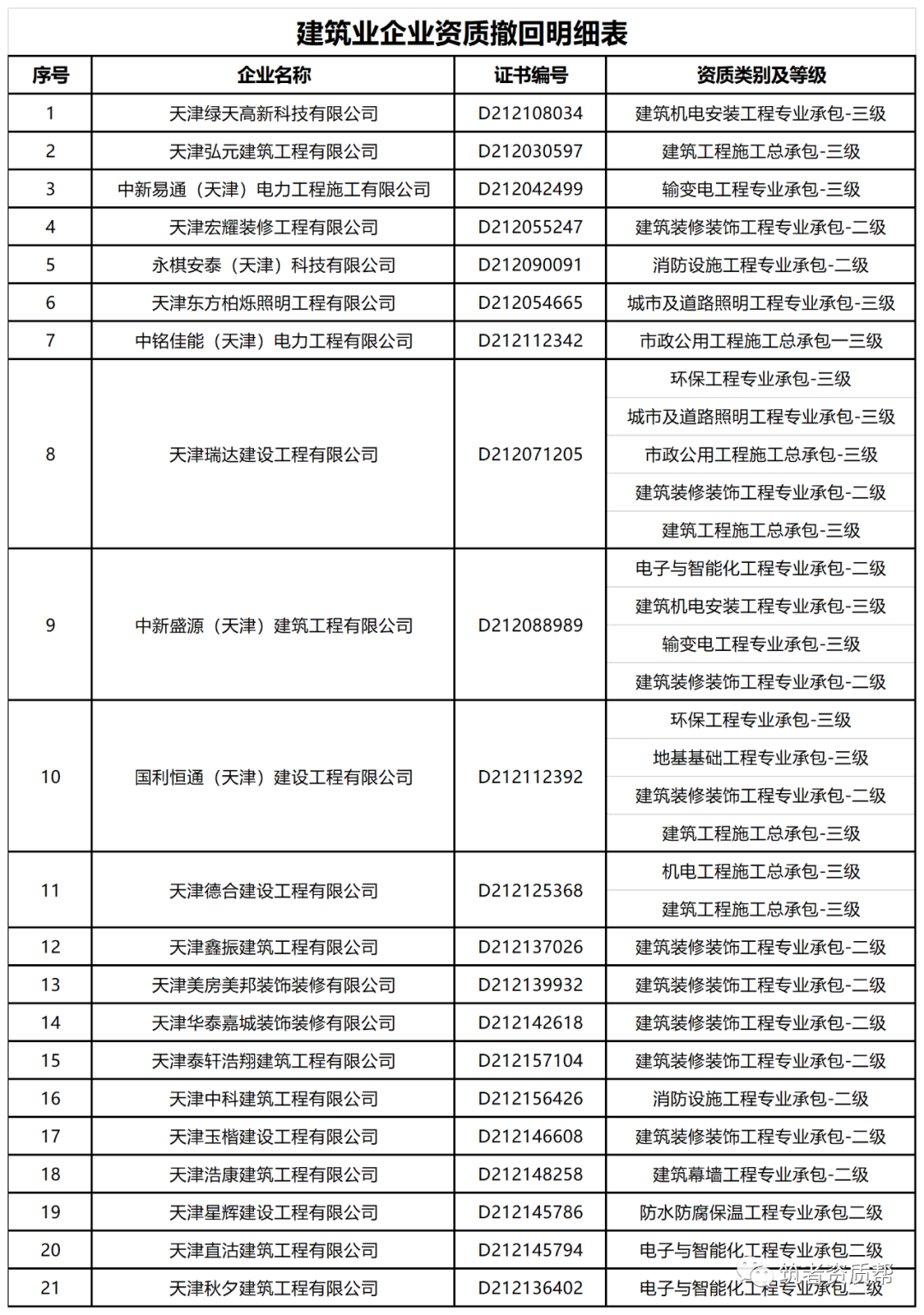 关于撤回天津绿天高新科技有限公司等21家企业有关建筑业企业资质的通告依据中新天津生态城建设局《关于撤回相关企业建筑业企业资质的函》(津生建函〔2023〕69号、70号),天津绿天高新科技有限公司等21家企业有关建筑业企业资质不再符合相应建筑业企业资质标准要求的条件。根据《建筑业企业资质管理规定》(住房城乡建设部第22号令)第二十八条、《关于印发〈天津市承诺审批事项事中事后监管办法〉的通知》(津职转办发〔2021〕1号)第十条等有关法律法规和规范性文件的规定,现依法撤回天津绿天高新科技有限公司等21家企业有关建筑业企业资质(见附件)。