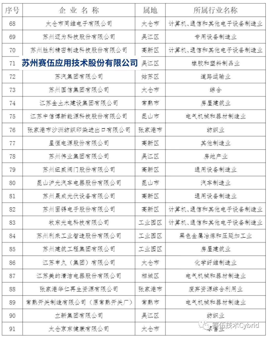 7月21日,苏州市优化营商环境暨民营经济高质量发展大会发布了“2023苏州民营企业100强”。其中赛伍技术2022年以营收人民币超40亿元位列第71位,是唯二入围苏州民营企业百强中的光伏高分子材料领域企业。