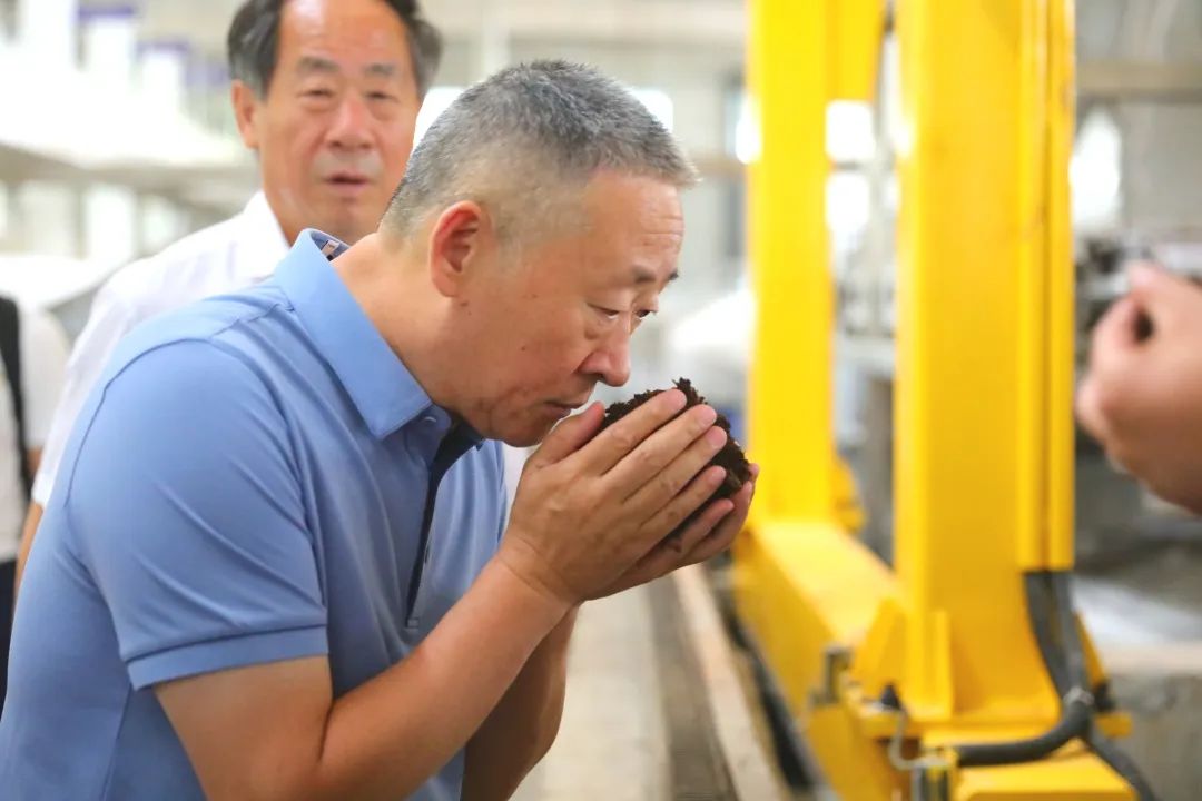 宋书玉一行首先来到公司酿造车间,对各个生产流程、工艺等环节进行了深入细致地了解,在查看堆积发酵糟醅后,他认为:糟醅发酵效果较好、香气舒适、糟醅松散度良好;箱床堆积与地面晾堂堆积相结合的方式很好地提升了堆积发酵的效果。随后,现场对刚酿造出的四轮次酱香原酒进行品尝,认为神农架四轮次酱酒风格典型、醇甜感突出、酒体干净、诸味协调,花香、果香明显,具有神农架酱酒的独特风格。