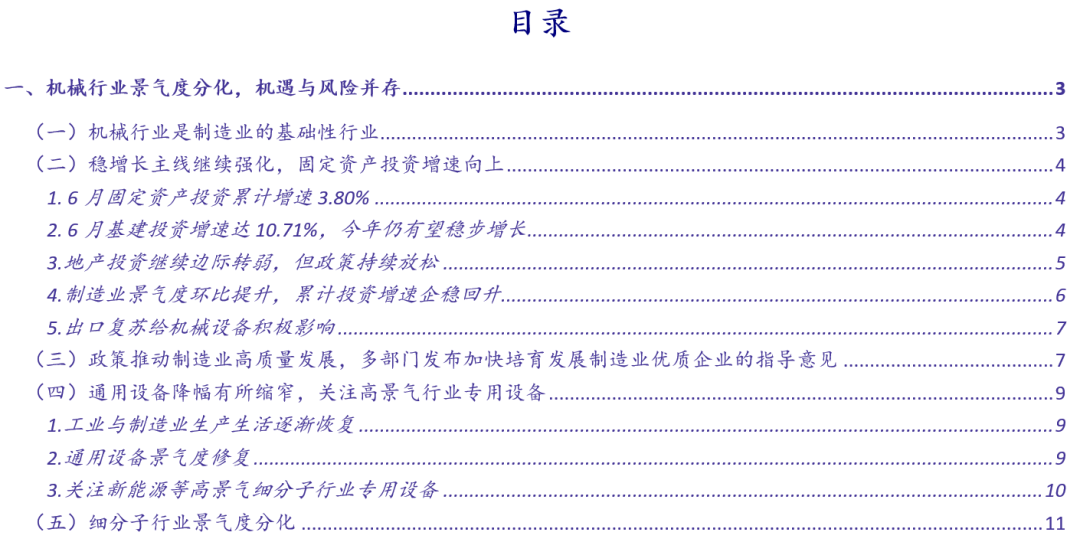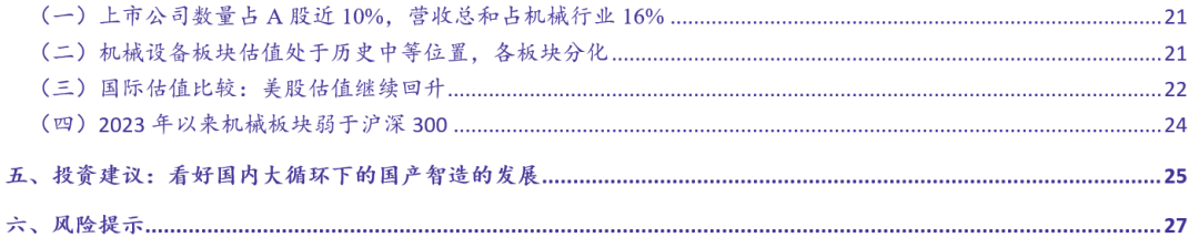 持续看好制造强国与供应链安全趋势下高端装备进口替代以及双碳趋势下新能源装备领域投资机会。建议关注:1)机械设备领域存在进口替代空间的子行业,包括数控机床及刀具、机器人、科学仪器、半导体设备等;2)新能源领域受益子行业,包括光伏设备、风电设备、核电设备、储能设备等;3)新能源汽车带动的汽车供应链变革下的设备投资,包括一体压铸、换电设备、复合铜箔等。