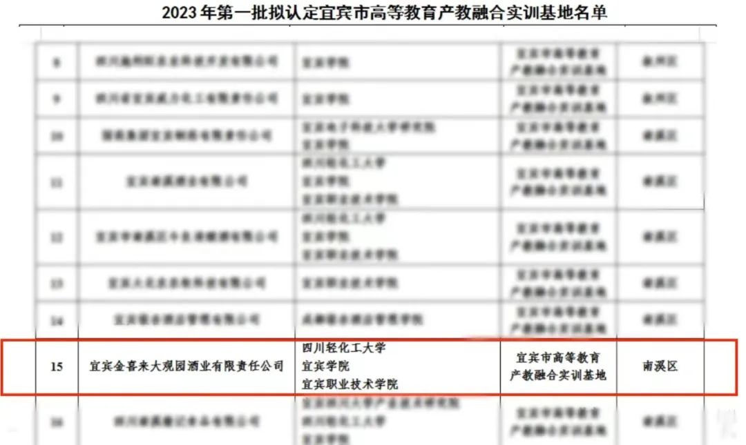 喜讯 | 丝丽雅集团旗下金喜来酒业获评为2023年第一批宜宾市高等教育产教融合实训基地