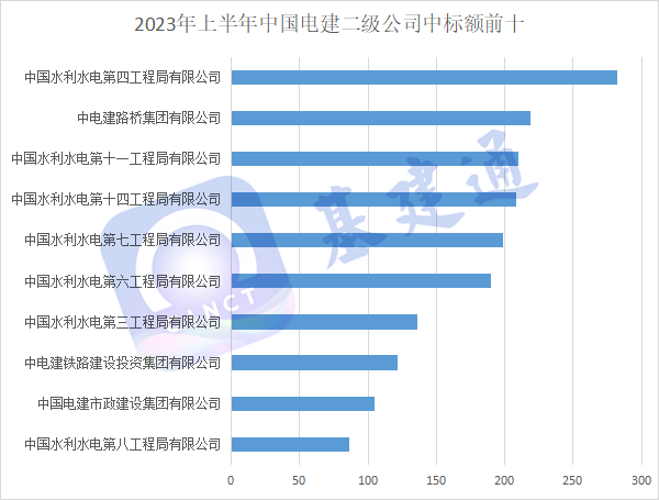 据基建通大数据库统计,中国电建集团二级单位在今年上半年的项目中标额排行榜前十如下:水电四局>电建路桥>水电十一局>水电十四局>水电七局>水电六局>水电三局>中电建铁路建设投资集团>电建市政>水电八局。