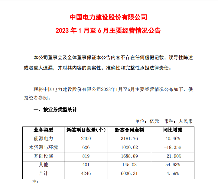 近日,中国电力建设集团有限公司(以下简称“中国电建”)发布了最新企业经营情况简报。
