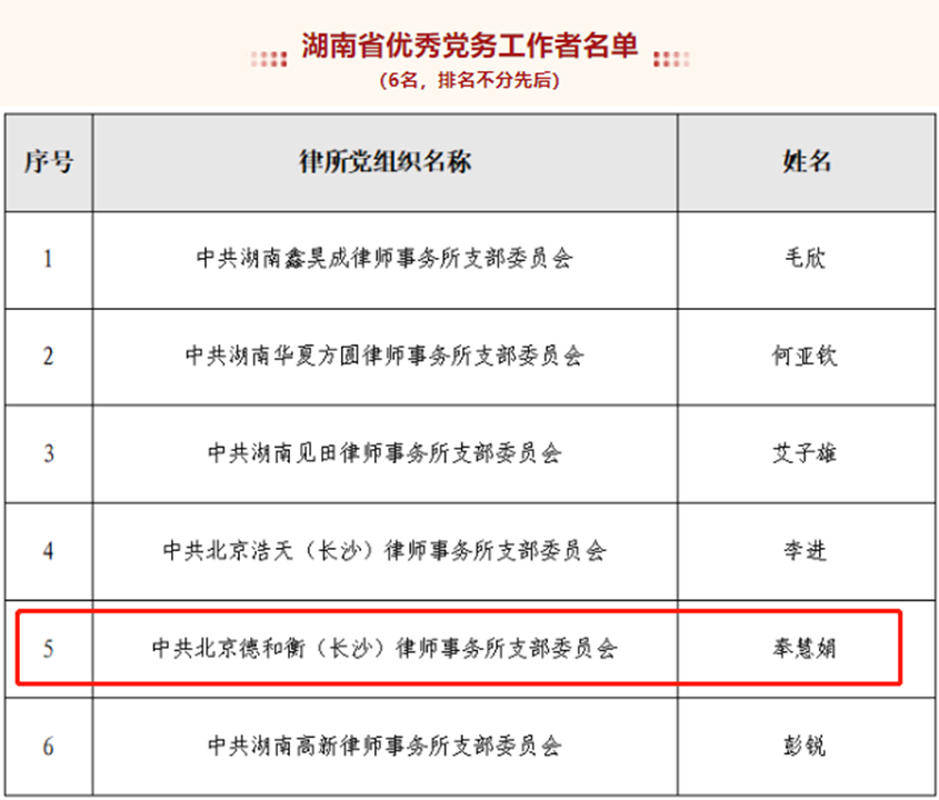 为庆祝中国共产党成立102周年,鼓励先进,树立典型,湖南省律师行业党委开展全省律师行业“先进党组织、优秀共产党员、优秀党务工作者”评选表彰活动。在这次评选表彰活动中,我所党支部荣获“湖南省律师行业先进党组织”称号,我所党支部副书记奉慧娟律师荣获“湖南省优秀党务工作者”称号。