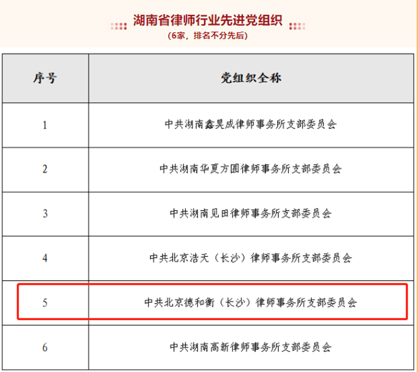 中共北京德和衡(长沙)律师事务所支部委员会成立于2018年8月,执业律师中有40余名中共党员,中共党员占比53%。我们将此次获评为契机,继续坚持和加强党的全面领导,坚持政治统领,坚持服务大局,坚持践行为民宗旨,坚持目标导向和问题导向相结合,不断提升律师工作管理能力和服务水平,按照司法部党组对全体律师提出的“五点希望”的要求,争做党和人民满意的好律师。