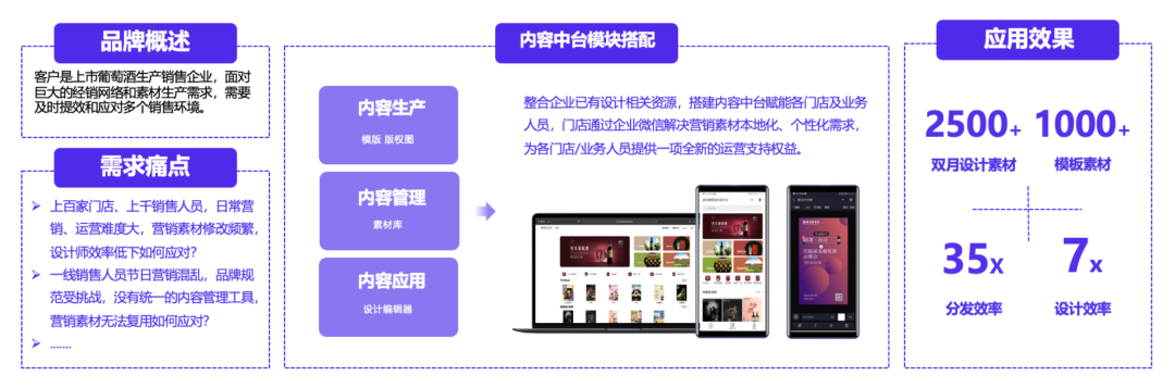 作为大型的葡萄酒生产与销售企业,在葡萄酒营销业务中存在运营物料下发不及时、素材无法统一管理、线下推广难的问题。基于对业务提效的需求,应用内容中台解决运营物料的制作和分发效率。