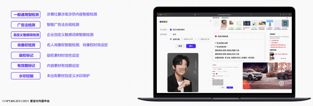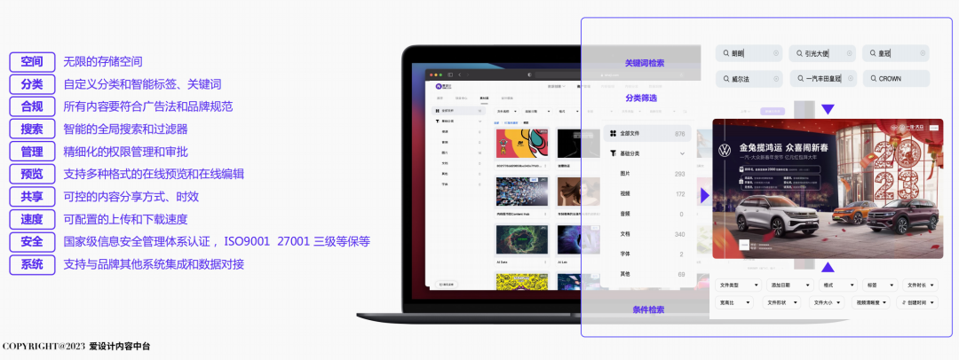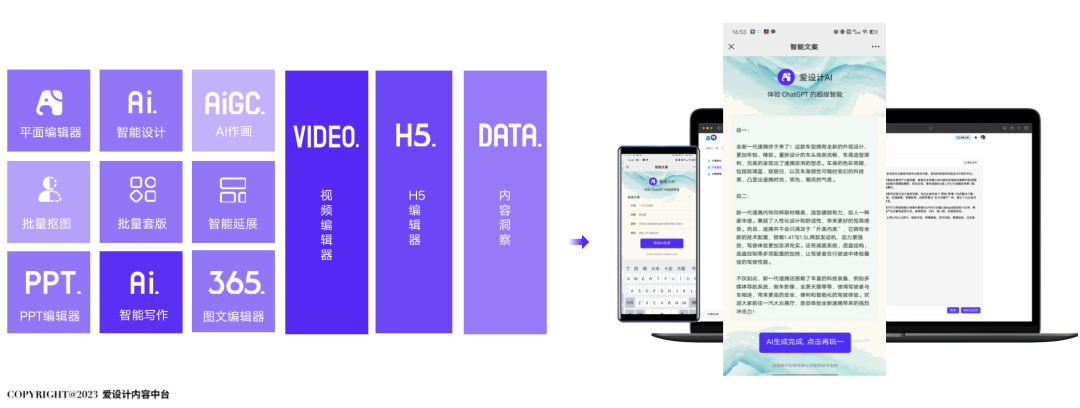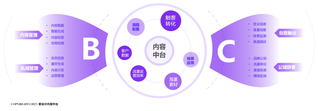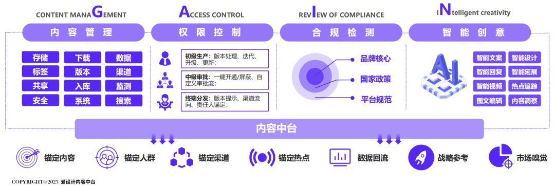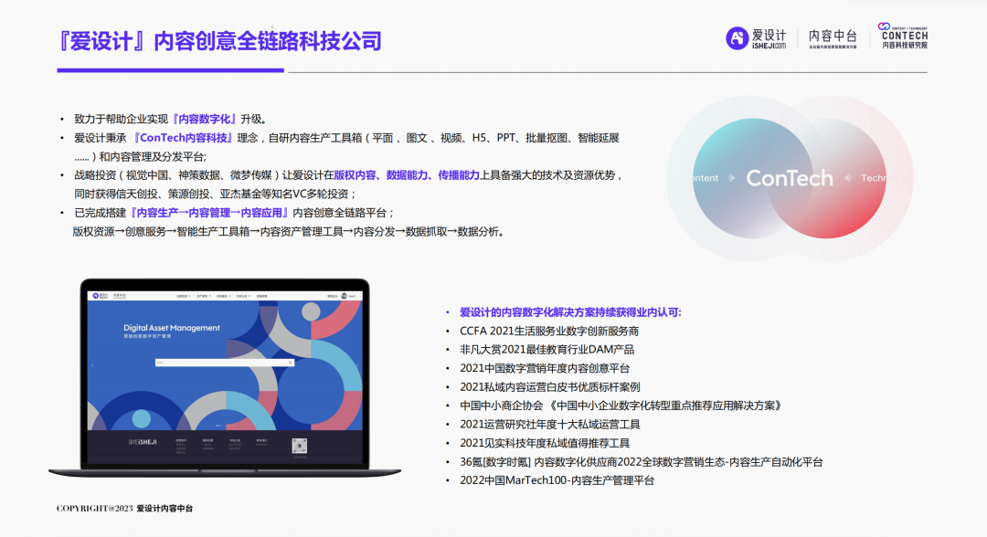 爱设计内容中台作为内容创意全链路的服务平台,整合版权资源→创意服务→智能生产工具箱→内容资产管理工具→内容分发→数据抓取→数据分析的链路,力图打造品牌最值得信赖的内容中台服务商。逐渐开放的社会环境,留给企业的思索空间已收缩,尽快投入趋势,才是拥抱市场的最佳选择。