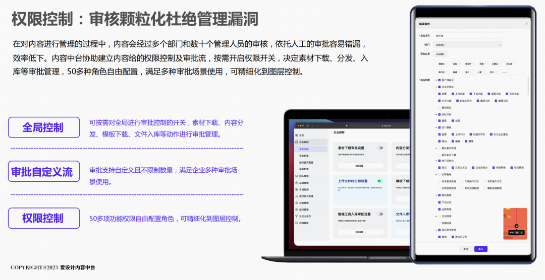 在对内容进行管理的过程中,内容会经过多个部门和数十个管理人员的审核,依托人工的审批容易错漏,效率低下。内容中台协助建立内容权限控制及审批流,按需开启权限开关,决定素材下载、分发、入库等审批管理,50多种角色自由配置,满足多种审批场景使用,可精细化到图层控制。