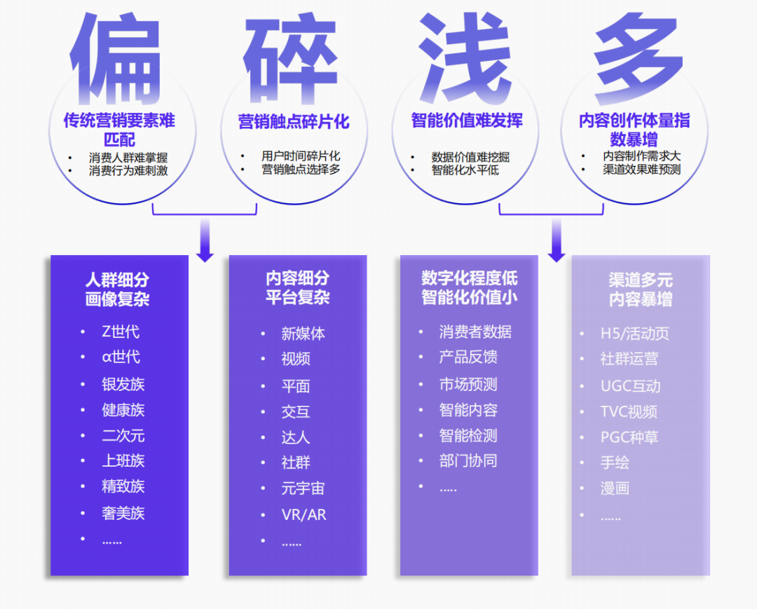 与前一世代的“单品化”、“大营销”的品牌环境不同,前端逐渐缩紧的流量红利要求食饮品牌必须将越来越精准的信息传递给消费者,才有机会建立与消费者的情感联系。随着体验经济时代的来临,消费者行为变化的瞬息莫测、营销数字化/智能化水平追不上、传播触点碎片化的渠道暴增、内容资产管理难度大以及创作效率低都制约着品牌的发展。
