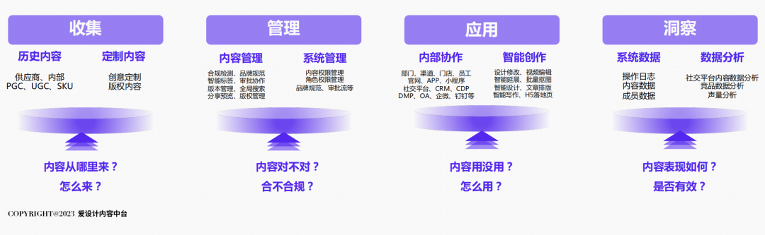 由于每个企业的规模、阶段不同,核心诉求也不同,但整体离不开关于内容的供给、管理、应用和数据洞察的诉求。通过与企业和品牌的深度对话,可以总结出:内容数字化也就是内容中台的全景图。边界清楚的内容管理形式会让每个部分更好协同,聚力达到营销效果最大化。