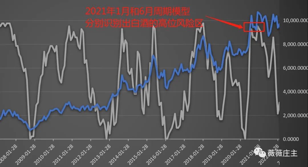 下图为截止到22年初的白酒板块的周期位置图(白色线是周期数据,蓝色线是白酒指数),回溯数据可以看出它对市场顶底的定位胜率较高,也在上一轮白酒顶部提示了我们高位风险。
