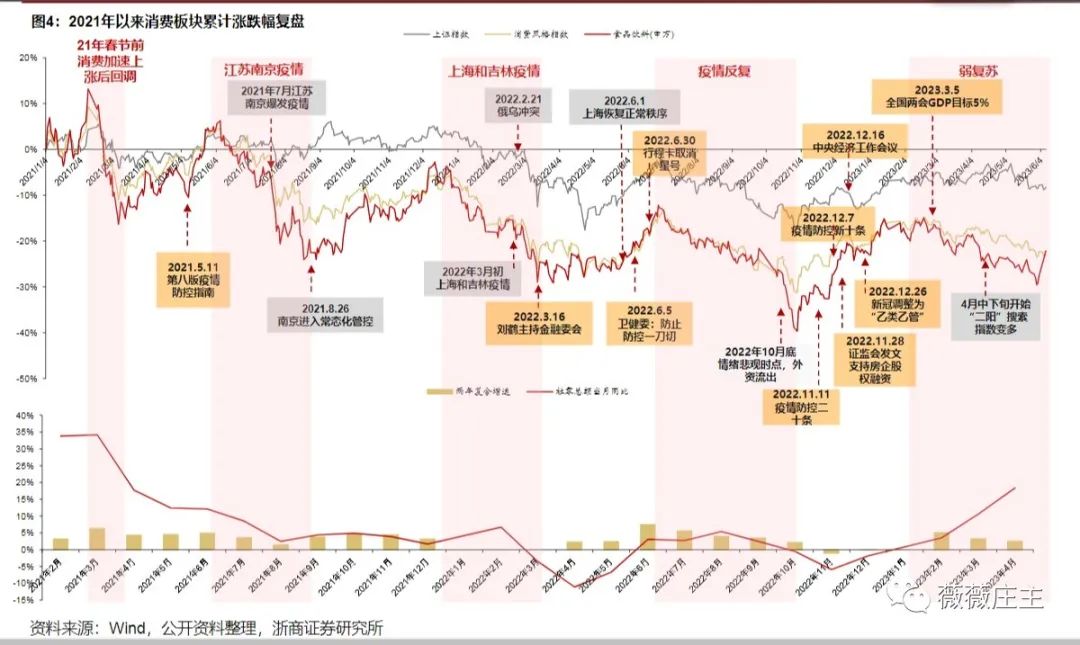 其实,自去年10月30日我提示 上证50 以及整体市场的周期位置触底反转以来,与其关联最大的整体大消费板块(下图灰色线)以及其细分行业 食品饮料 (下图黄色线)等板块已经完成了底部结构反转,但由于3月来经济基本面复苏较弱不及预期,叠加汇率调整等因素,整体消费板块回调明显,并开始进入大型头肩底构造过程中。