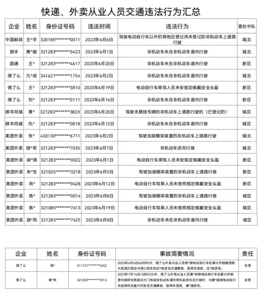 以下是2023年6月份查处的快递、外卖电动自行车交通违法、事故情况,现予以公布。